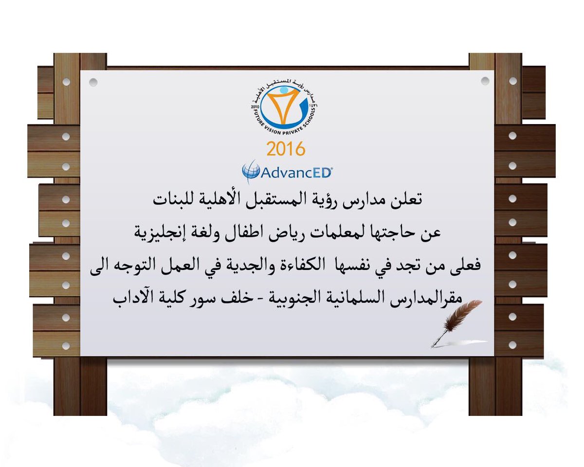 أعلنت مدارس رؤية المستقبل الأهلية للبنات بمحافظة في الهفوف، عن توفّر وظائف تعليمية شاغرة للنساء، للعمل بمقر المدارس بالسلمانية الجنوبية في الهفوف.