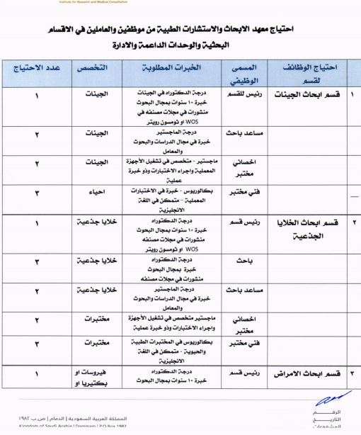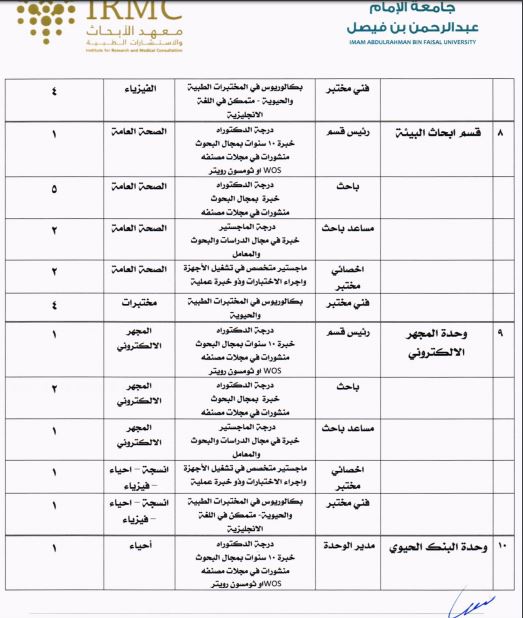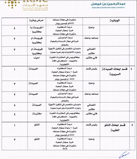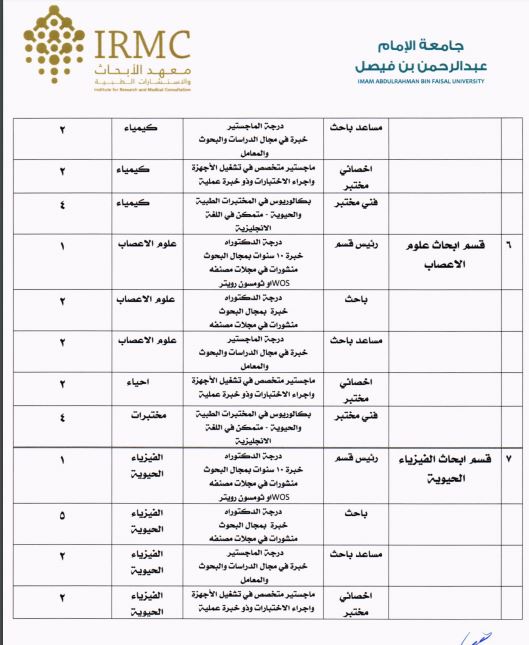 أعلنت جامعة الإمام عبدالرحمن بن فيصل، عبر موقعها الإلكتروني، عن توفّر عدد (105) وظيفة شاغرة للجنسين في معهد الأبحاث والإستشارات الطبية، لحمَلة درجة الدكتوراه، ودرجة الماجستير، ودرجة البكالوريوس في عدد من التخصصات، وذلك للعمل في الأقسام البحثية والوحدات الداعمة والإدارة.