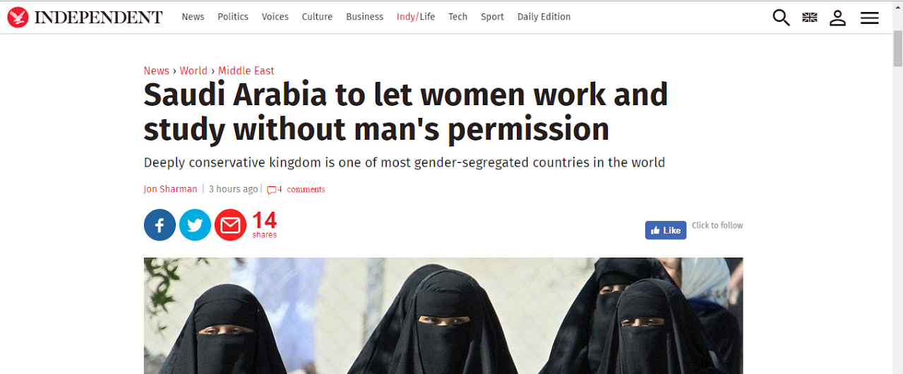 سلطت صحيفة “الإندبندنت” البريطانية، الضوء على قرار خادم الحرمين الشريفين الملك سلمان بن عبد العزيز آل سعود، والذي يمكن المرأة في المملكة من الحصول على الخدمات دون موافقة ولي أمرها ما لم يكن هناك سند نظامي لهذا الطلب وفقا لأحكام الشريعة الإسلامية .