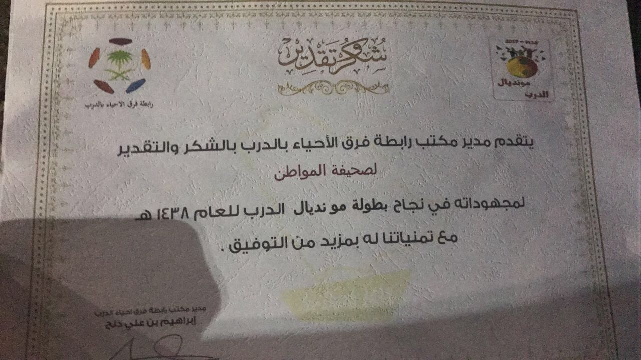 كَرّمت إدارة مونديال الدرب الرياضي بجازان صحيفة “المواطن” وذلك في حفل ختام فعالياته، حيث سلم المحافظ حسن عبدالله أبو شرحة شهادة التكريم لمراسل الصحيفة الإعلامي الصغير الزميل يوسف حمود لرعايتها فعاليات المونديال.