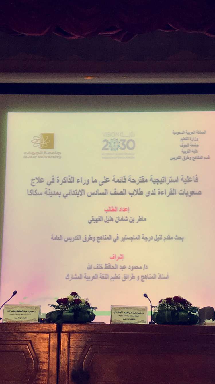 وكانت الرسالة بعنوان (فاعلية استراتيجية مقترحة قائمة على ما وراء الذاكرة في علاج صعوبة القراءة لدى طلاب الصف السادس الابتدائي بمدينة سكاكا).