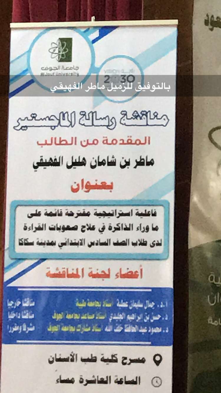 هذا وقد كانت المناقشة يوم أمس الثلاثاء على مسرح كلية طب الأسنان بجامعة الجوف وقد حضر المناقشة عدد من الأهل والأقارب والزملاء والطلاب.