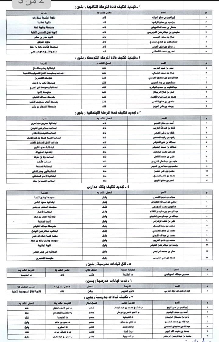 وأوضح أمين لجنة القيادات المدرسية الأستاذ مسلم المزيني، أن قرار الحركة شمل التجديد لعددٍ من القيادات المدرسية لمدة عام دراسي في مواقع عملهم، ونقل آخرين لمدارس أخرى، وتكليف معلمين ومعلمات للعمل في القيادة المدرسية.