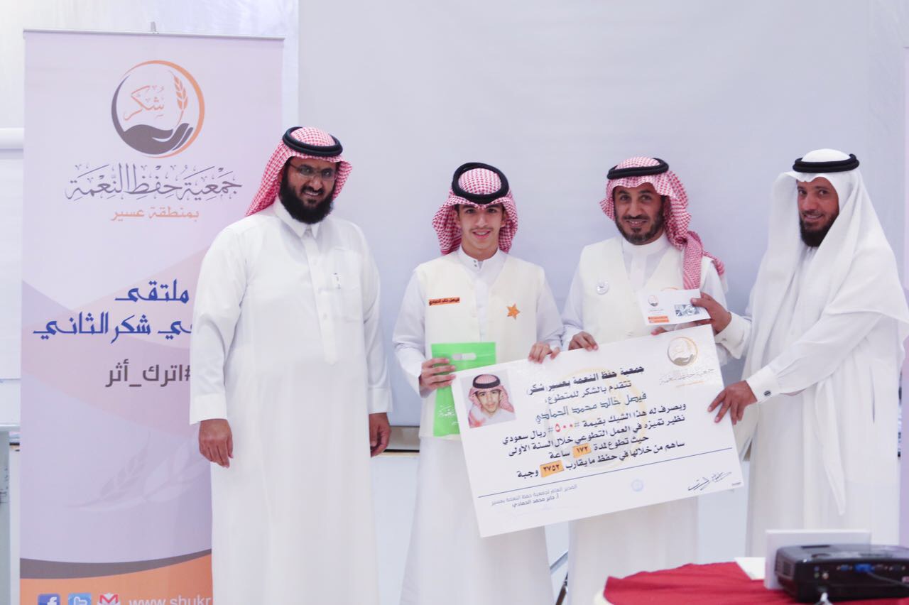 واختتم اللقاء بتكريم متطوعي جمعية شكر ، وإعطاء وسام النجمة لكل من علي مشافي والذي حقق المركز الأول بـ260 ساعة عمل وشارك في حفظ 4260 وجبة وماجد الشهراني الذي حلّ في المركز الثاني بواقع 212 ساعة عمل وشارك في حماية 3392 وجبة و فيصل الحمادي بواقع 172 ساعة عمل وشارك في حماية 2752 وجبة.
