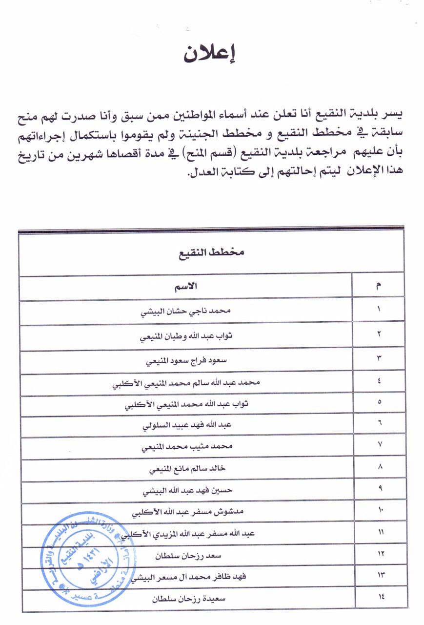أعلنت بلدية النقيع أسماء المواطنين ممن سبق وصدر لهم منح سابقة في مخطط النقيع ومخطط الجنينة ولم يستكملوا بياناتهم، داعيةً إياهم إلى مراجعة قسم المنح بالبلدية في مدة شهرين على أقصى تقدير من تاريخ هذا الإعلان.
