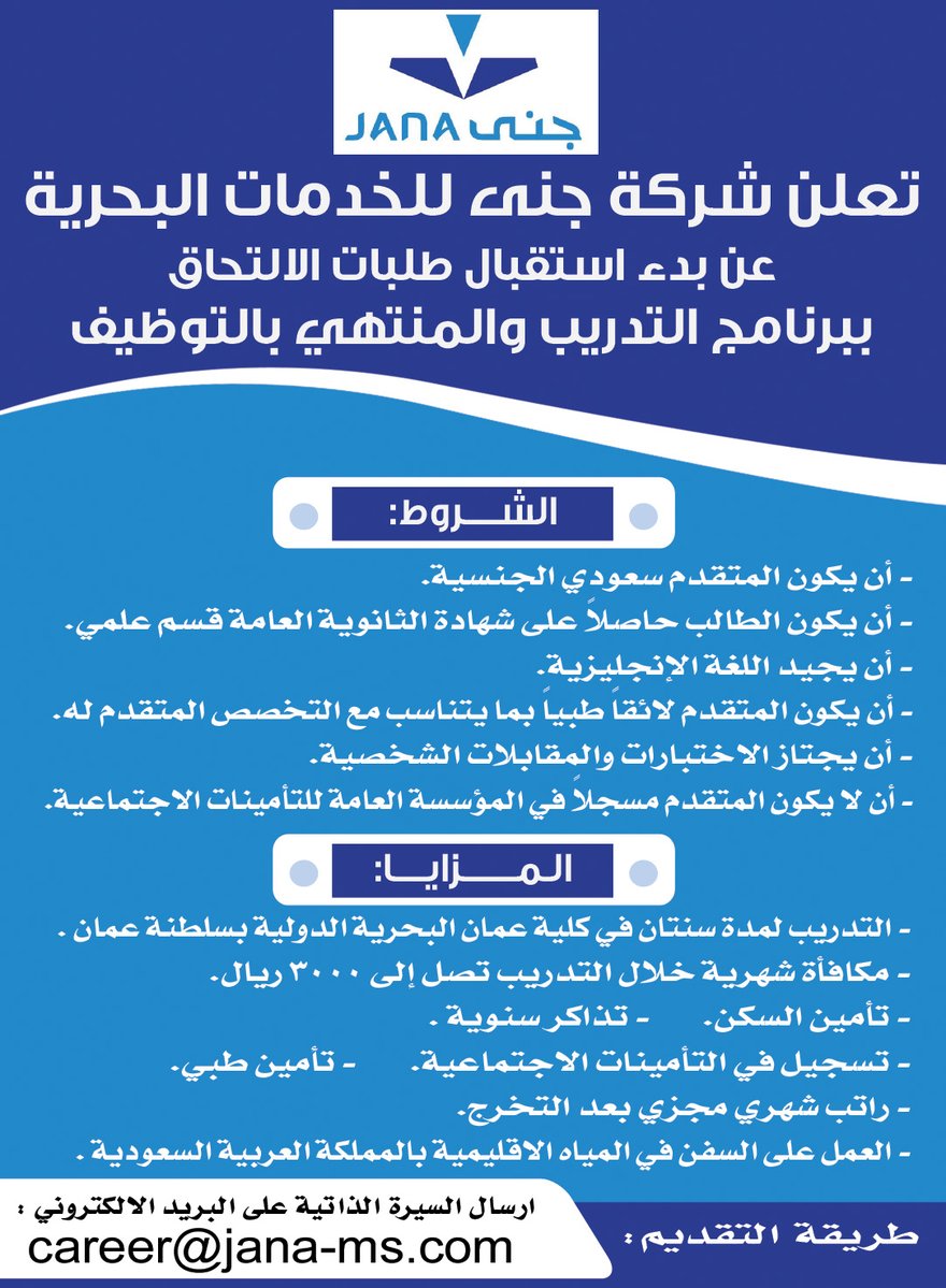 أعلنت شركة جنى لخدمات الملاحة البحرية عن بدء استقبال طلبات الالتحاق ببرنامج التدريب والمنتهي بالتوظيف، وذلك وفق الشروط التالية: