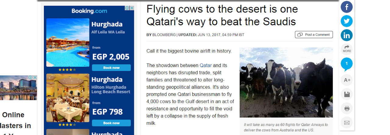 ردت قطر على قرارات القطيعة الدبلوماسية التي أصدرتها دول الخليج بقيادة المملكة العربية السعودية، والتي تتضمن إغلاقًا كاملاً لكافة المجالات البرية والبحرية والجوية لتلك البلدان في وجه الدوحة، بعمل أكبر جسر جوي لنقل الأبقار في العالم.