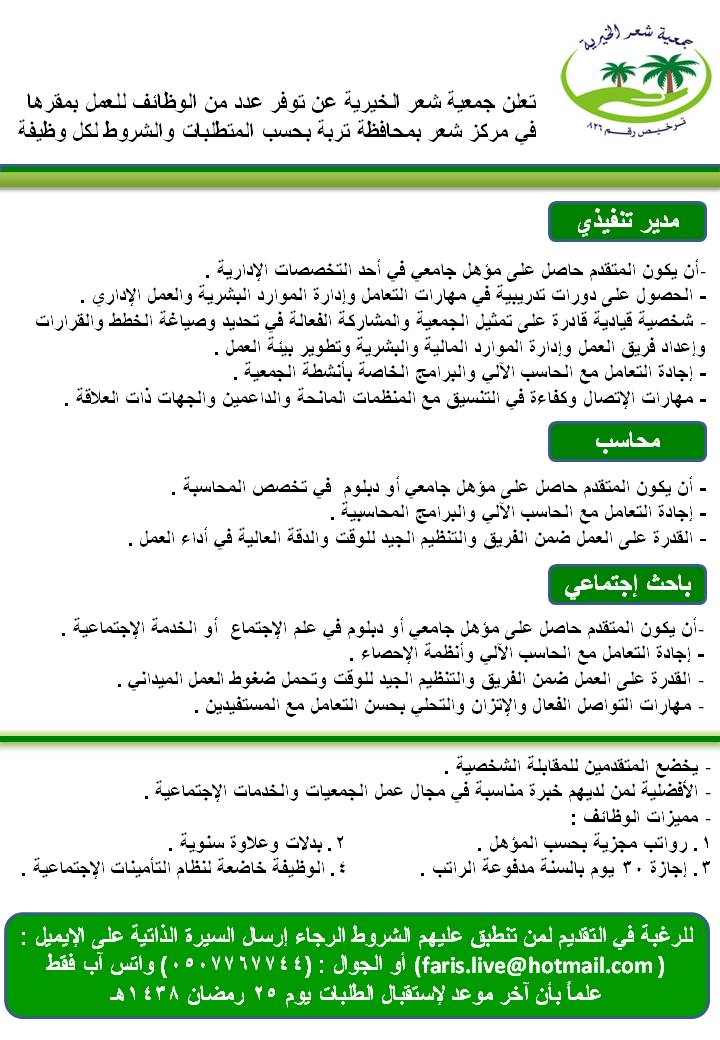 أعلنت جمعية شعر الخيرية بتربة عن توفّر وظائف إدارية شاغرة، للعمل بمقرها في مركز شعر بمحافظة تربة.