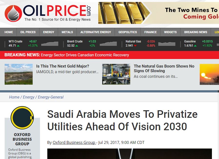 أبرز موقع “أويل برايس” العالمي، جهود المملكة العربية السعودية في سعيها لتحقيق كافة الطموحات والرؤى الخاصة بالخطة الاقتصادية الشاملة 2030 والتي أطلقها ولي العهد الأمير محمد بن سلمان العام الماضي، مشيدًا بالجهود الواسعة التي تتخذها الحكومة لتسريع خطوات الخصخصة بشكل رئيسي في الفترة الماضية.