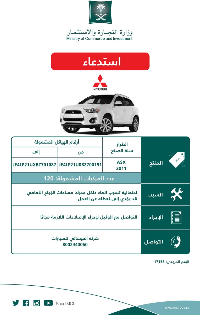 وقالت الوزارة عبر حسابها على “تويتر”: “إنه تم استدعاء 120 مركبة ميتسوبيشي (ASX) موديل 2011، لاحتمالية تسرب الماء داخل محرك مساحات الزجاج قد يؤدي إلى تعطلها”.