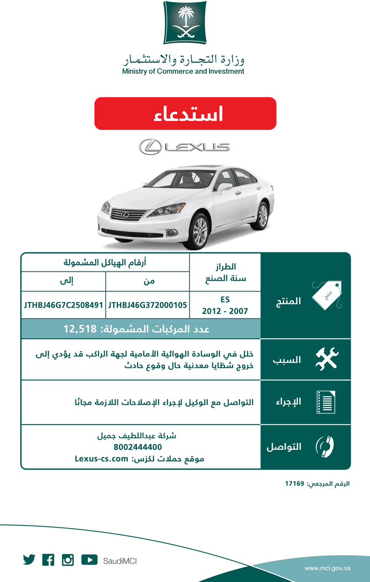 استدعت وزارة التجارة، 12.518 مركبة ماركة لكزس (ES 2007-2012)؛ بسبب خلل في الوسادة الهوائية الأمامية لجهة الراكب.