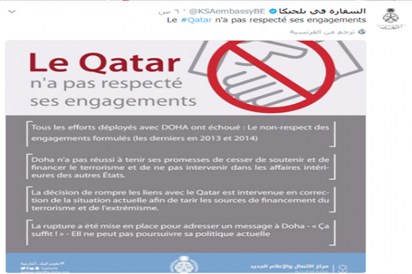 بلغات مختلفة قدمت حسابات سفارات المملكة لدى بعض الدول، ومنها البرتغال وتركيا، إنفوجرافيك على موقع التواصل الاجتماعي “تويتر”، تأكيدات على أن قطر لم تلتزم بتعهداتها ولم تفِ بوعدها بخصوص وقف تمويل ودعم الإرهاب.