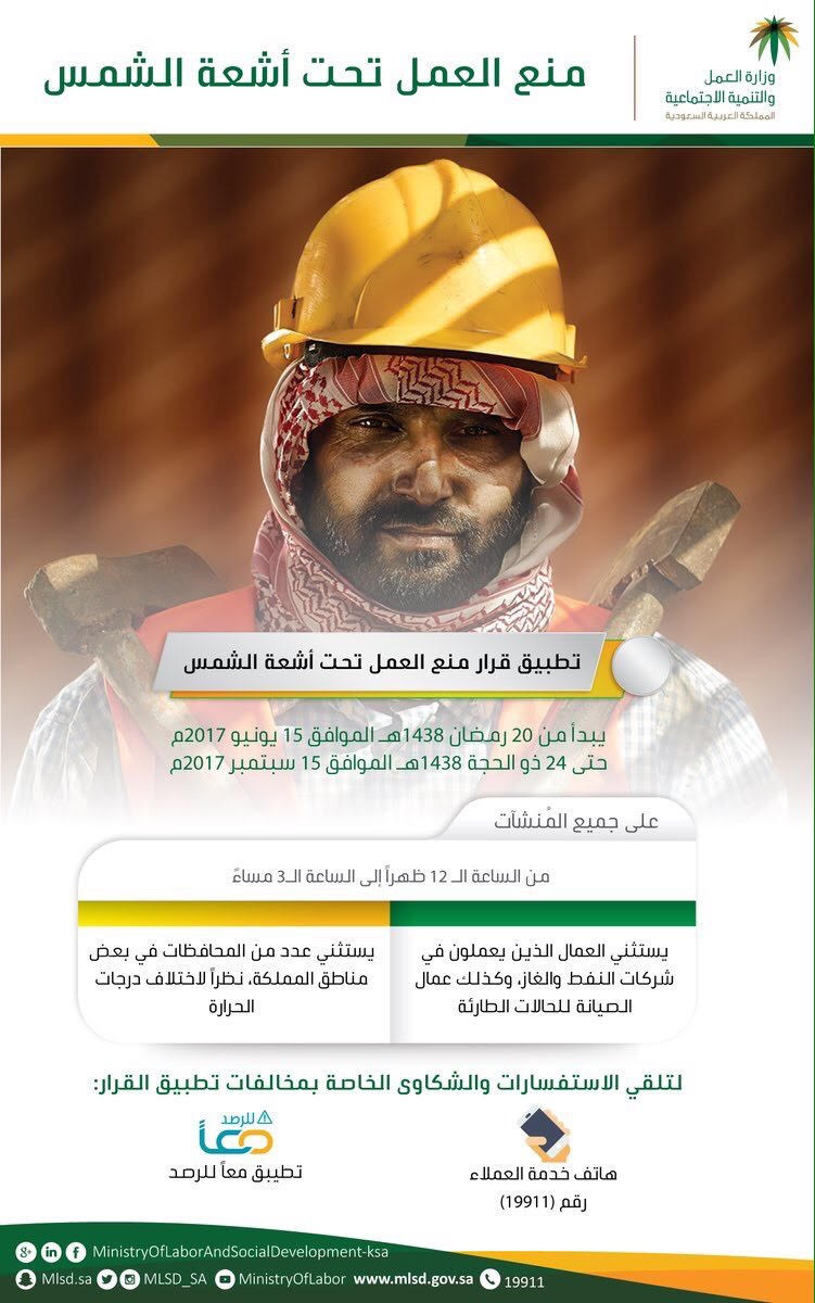 ويحرص فرع وزارة العمل والتنمية الاجتماعية بمنطقة الرياض على تطبيق هذا القرار الوزاري طوال الفترة المعلن عنها من أجل سلامة وصحة العاملين في القطاع الخاص وتطبيق معايير السلامة المهنية، وتوفير بيئة عمل صحية وآمنة لهم وفق اعتبارات السلامة والصحة المهنية، وما تقتضيه مصلحة العمل لضمان تجنيب العمال ما قد يسبب مخاطر صحية لهم.