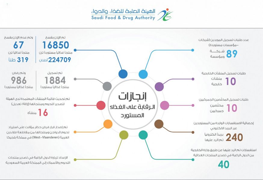 رفضت الهيئة العامة للغذاء والدواء تسجيل 986 منتجاً غذائياً لم تستوف الشروط، فيما أذنت بفسح 16850 منتجاً غذائياً مستورداً بلغ وزنها 224709 أطنان، ورفضت الإذن بفسح 67 منتجاً غذائياً لمخالفتها للوائح والمواصفات القياسية.