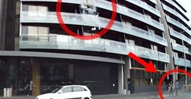 وقع الحادث في كارلتون في ملبورن، وظهر زوجان يمشيان على الرصيف بهدوء قبل أن تنفجر الشرفة الزجاجية دون سابق إنذار وكادت تعرض حياتهما للخطر.