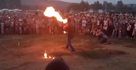 وأظهر مقطع فيديو رجل يحيط به حشد من الناس ينفث النيران من فمه، إلا أن النار اشتعلت في وجهه وسقط على ركبتيه في محاولة لإطفائها.