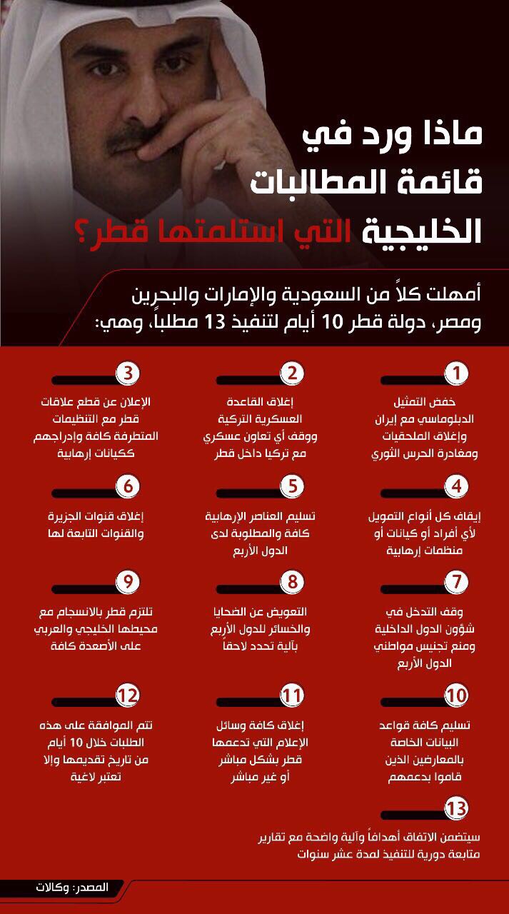 10 أيام لمراجعة 13 مطلبًا من 4 دول.. جملة تلخص فترة زمنية لن تُنسى من تاريخ العرب والمنطقة، فالحسم كان عنوانها، وترقب المستقبل أساسها، وها هي قطر تسلم ردها على المطالب الـ13 التي قدمتها الدول الأربعة الداعية لمكافحة الإرهاب، المملكة ومصر والإمارات والبحرين.