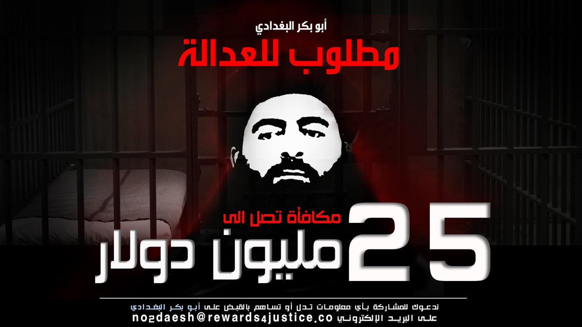 رصدت القيادة المركزية الأميركية، مكافأة بأكثر من 25 مليون دولار، لمن يقبض على أبو بكر البغدادي، زعيم تنظيم داعش الإرهابي.