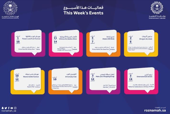 ويمكن الوصول إلى معلومات أكثر عن الأنشطة الترفيهية وذلك بمتابعة حساب روزنامة الترفيه على قنوات التواصل الاجتماعي @Roznamah_sa .