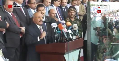 في استعراض لقوته وقدرته على حشد أنصاره ظهر الرئيس اليمني السابق على عبدالله صالح اليوم في ميدان السبعين وسط مجموعة من أنصاره في رسالة موجهة إلى الحوثي حليفه المزعوم بعد الانتقادات الأخيرة التي وجهها له.