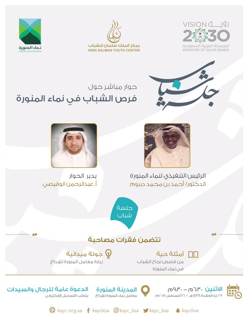 تتجه أنظار الشباب الطموح إلى المدينة المنورة، يوم الاثنين المقبل 21 آب/أغسطس 2017، حيث يطلعهم مركز الملك سلمان للشباب، امتداداً لاستراتيجيته في دعم وتمكين وتحفيز جيل المستقبل، ومن خلال مبادرة “جلسة شباب”، على الفرص الكبيرة التي تتيحها لهم “نماء المنورة”، لتطوير أعمالهم، وتعزيز خبراتهم.