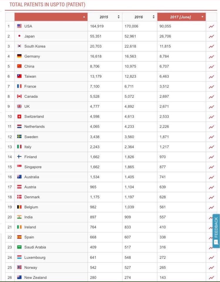 وجاءت في الصدارة، أميركا بأكثر من 90 ألف براءة اختراع، أما ثانيًا فكانت اليابان، ثم كوريا الجنوبية، ورابعًا ألمانيا.