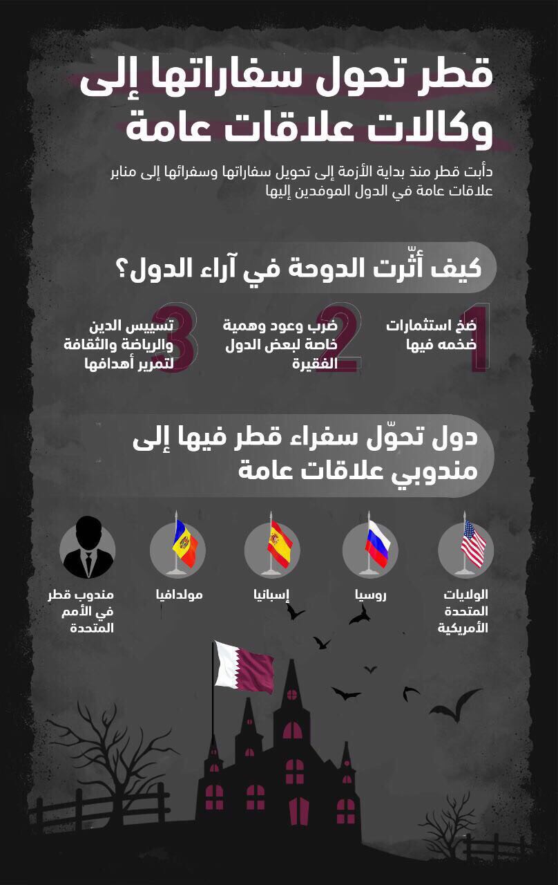 حوّلت قطر سفاراتها إلى وكالات علاقات عامة، وذلك بعد أن دأبت الدوحة منذ بداية الأزمة على التأثير في آراء الدول، وهو ما يتم عبر ضخ استثمارات في بعض الدول، مع ضرب وعود وهمية، خاصةً لبعض الدول الفقيرة.