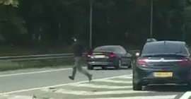 رصد سائق سيارة لحظة قفز مجموعة من المهاجرين غير الشرعيين خارج شاحنة متحركة على الطريق السريع.