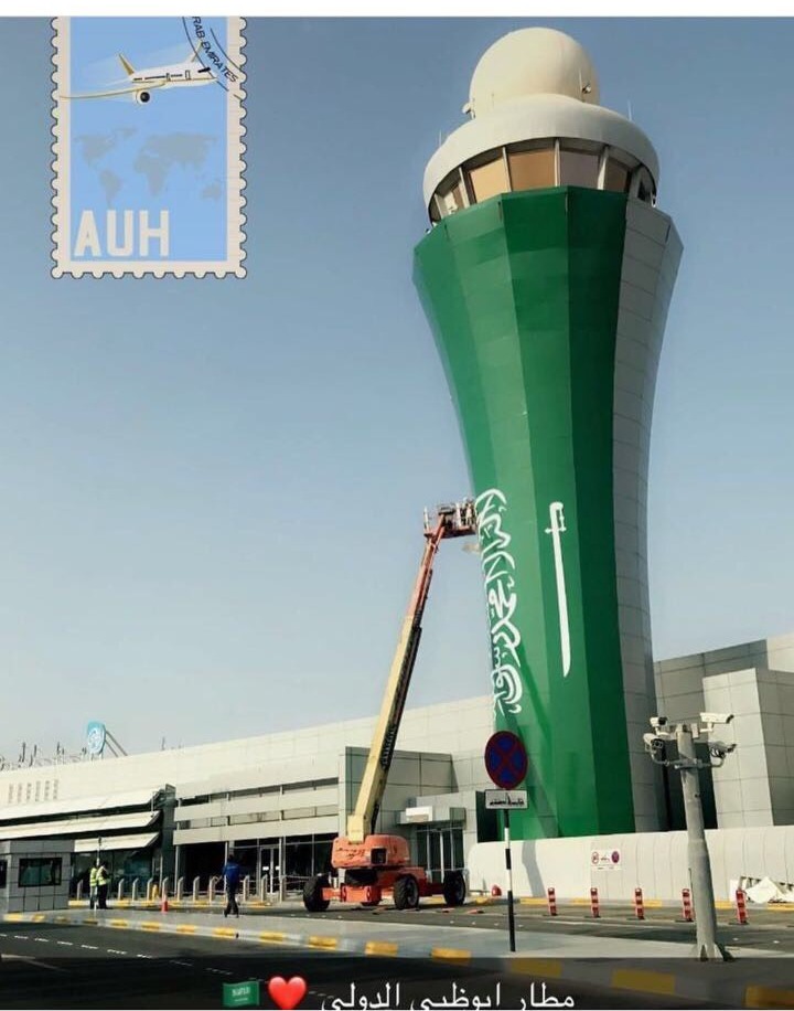 وبينت صورة متداولة على مواقع التواصل الاجتماعي، مطار أبو ظبي وهو في لون أخضر يتوسطه شعار المملكة “لا إله إلا الله” وسيف الحسم.