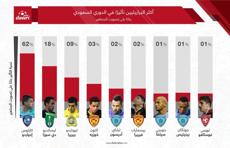 نشر موقع “دوري بلس”، عبر حسابه الرسمي على موقع “تويتر”، تصويتًا لأكثر اللاعبين البرازيليين تأثيرًا مع أنديتهم حتى الآن في بطولة الدوري السعودي.