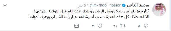 وقال محمد الناصر في تغريدة عبر حسابه الرسمي على موقع “تويتر”: “كارينيو طار من بلده ووصل الرياض وانتظر عدة أيام قبل التوقيع النهائي! إلا أنه خلال كل هذه الفترة نسي أن يشاهد مباريات الشباب ويعرف أدواته!”.
