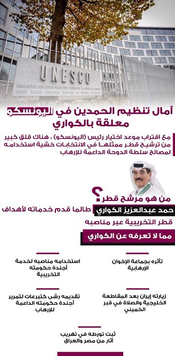 مع اقتراب موعد اختيار رئيس اليونسكو، تصاعد قلق كبير من فوز مرشح قطر في الانتخابات؛ خشية استخدامه لمصالح سلطة الدوحة الداعمة للإرهاب.