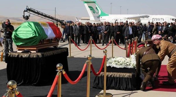 وأطلقت المدفعية في المطار 21 قذيفة، و21 طلقة نارية، تحية عسكرية، فيما حمل جمع من ضباط قوات البيشمركة جثة الرئيس الراحل، وسط ترديد النشيد القومي الكردي.