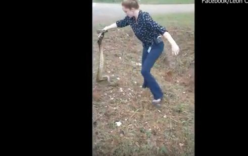 وأظهر مقطع فيديو لحظة قيام المرأة بالإمساك بالثعبان الذي حاول الالتفاف حولها.