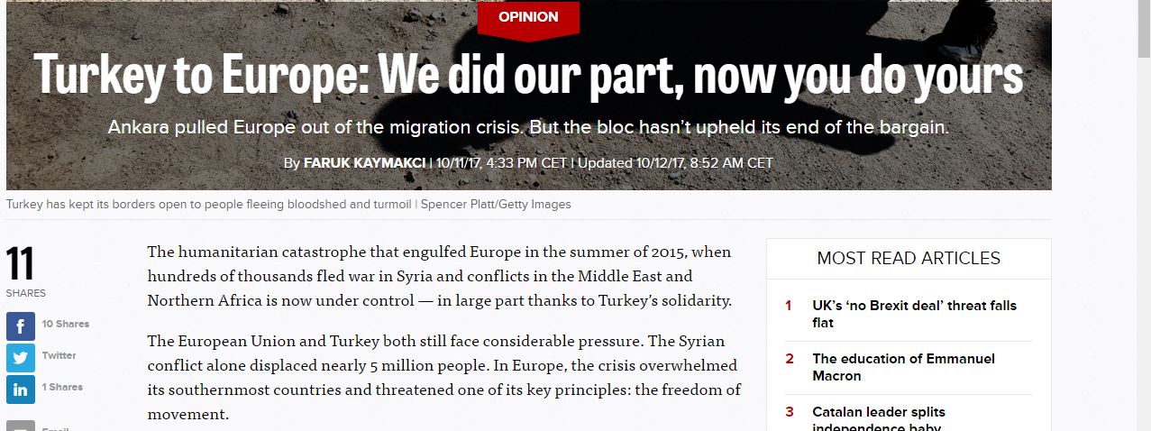 ولفت الدبلوماسي التركي إلى أن هناك العديد من المقتضيات التي تفرضها الظروف الحالية، والتي من دونها كان طريق اللاجئين السوريين مُمَهدًا، في إشارة إلى أن تركيا لا تزال تملك ورق ضغط على اليورو، حال استمراره في موقفه الرافض لكافة المساعي التي تبذلها أنقرة للدخول في عضوية الاتحاد.