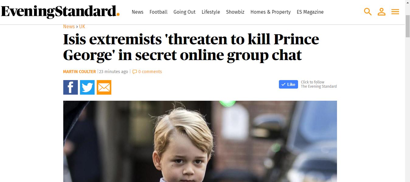 كثفت الاستخبارات البريطانية من نشاطاتها التأمينية الخاصة بالأمير جورج، في أعقاب إرسال عناصر تدعي انتمائها لتنظيم “داعش” صور للأمير الصغير أثناء وقوفه بجوار مدرسته، وكتبوا عليها “المدرسة تبدأ مبكرًا”، وذلك عبر تطبيق “تليغرام”، وهو الأمر الذي أثار حالة من القلق على حياة الطفل الملكي في بريطانيا.
