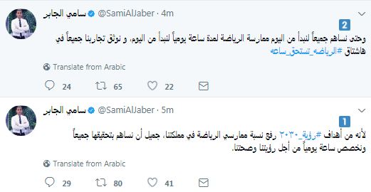 وقال الجابر: «لأنه من أهداف #رؤية_٢٠٣٠ رفع نسبة ممارسي الرياضة في مملكتنا، جميل أن نساهم بتحقيقها جميعاً ونخصص ساعة يومياً من أجل رؤيتنا وصحتنا».