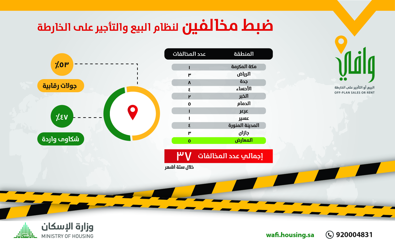 وتأتي الجولات الرقابية التي تقوم بها الوزارة ممثلة في برنامج “وافي” في إطار دور البرنامج لحماية السوق من عمليات البيع والتسويق الوهمية للمشاريع داخل وخارج المملكة، إذ شملت هذه المشاريع المخالفة كلاً من مكة المكرمة والرياض وجدة والأحساء والخبر والدمام إضافة إلى عرعر وعسير والمدينة المنورة وجازان، وجاءت 47% من هذه المخالفات عن طريق شكاوى من مواطنين، و53% منها عبر جولات رقابية نفذها البرنامج.