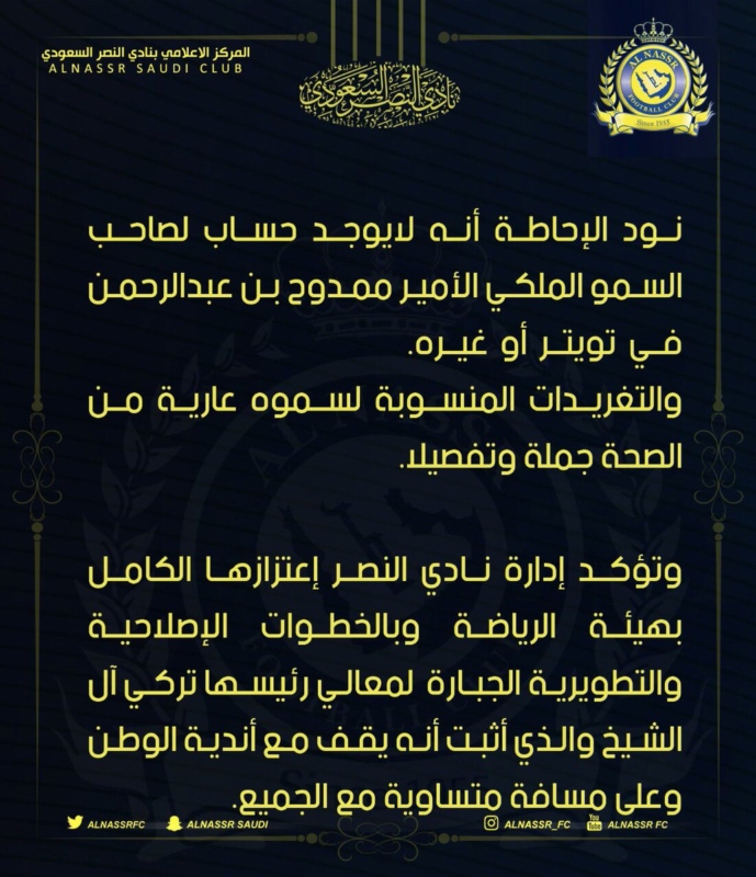 إدارة النصر تنفي امتلاك ممدوح بن عبدالرحمن حسابًا على تويتر
