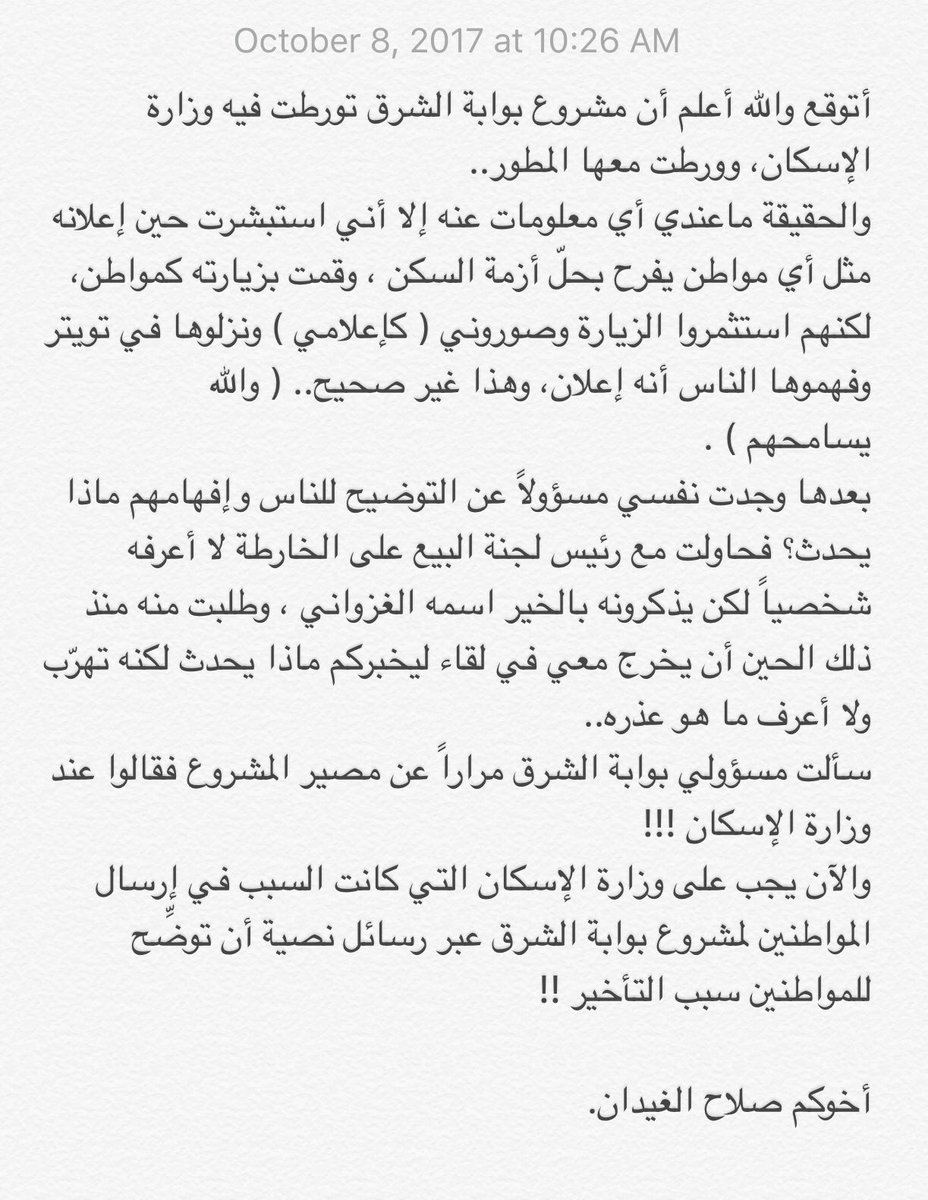 وكتب الغيدان في تغريدة له على “تويتر”: “تفضل يا الغالي.. هذا كل ما لديّ عن مشروع بوابة الشرق.. وأطلب تدخُّل هيئة مكافحة الفساد إذا كان التعطيل في أنظمتهم يُعتبر فسادًا”، مرفقًا بها صورة.