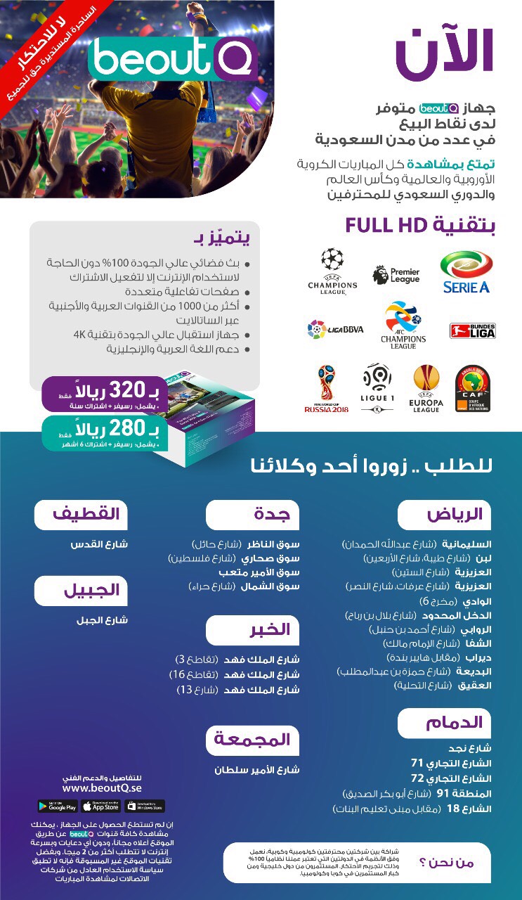 أعلنت شركة beoutQ عن طرح جهازها لدى نقاط البيع في عدد من المدن السعودية، للتمتع بمشاهدة كل المباريات الكروية والأوروبية والعالمية وكأس العالم والدوري السعودي للمحترفين.