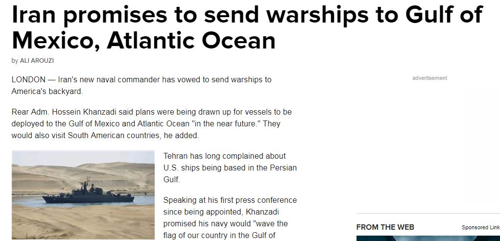 قبل ثلاثة أعوام، هددت البحرية الإيرانية بمطاردة الأسطول الأميركي من الخليج العربي حتى خليج المكسيك، وذلك ضمن فيلم وثائقي بثه التلفزيون الإيراني، كما قال سلف خان زادي، حبيب الله ساياري، في عام 2014: إن إيران تعتزم إرسال سفن قريبة من الحدود البحرية الأميركية كمعارضة لوجود البحرية الأميركية في الخليج العربي.
