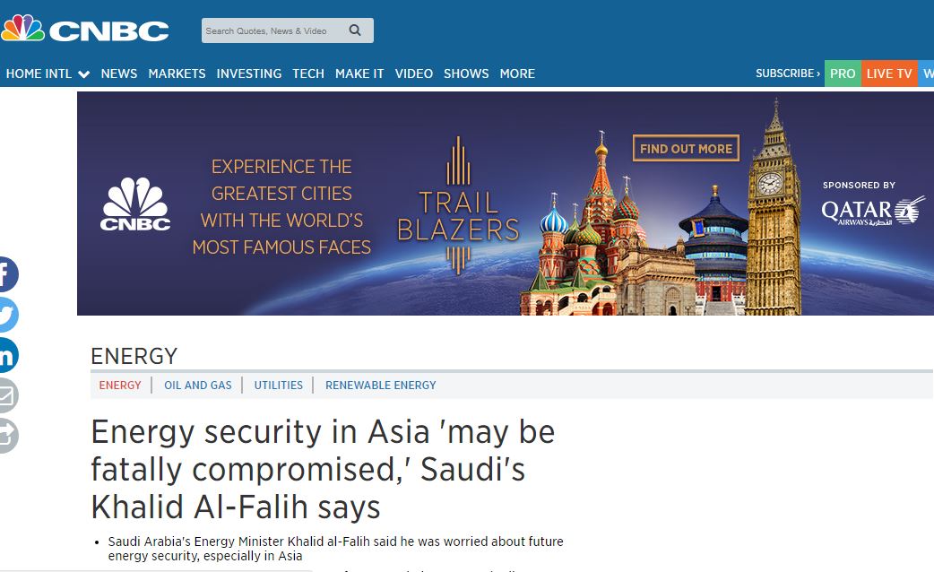 وكشف وزير الطاقة والثروة المعدنية، خالد الفالح، عن أزمة جديدة تلوح في الأفق بأسواق النفط العالمية، حيث أعرب خلال حديث للصحفيين في بانكوك، عن قلقه إزاء مستقبل أمن الطاقة، لا سيما في ظل ارتفاع الطلب المتزايد في آسيا.