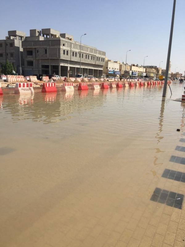 تجمعت كمية ضخمة من المياه بسبب تضرر إحدى مواسير المياه في طريق حمزة بن عبدالمطلب، بالرياض مما سببت إعاقة لحركة المرور.