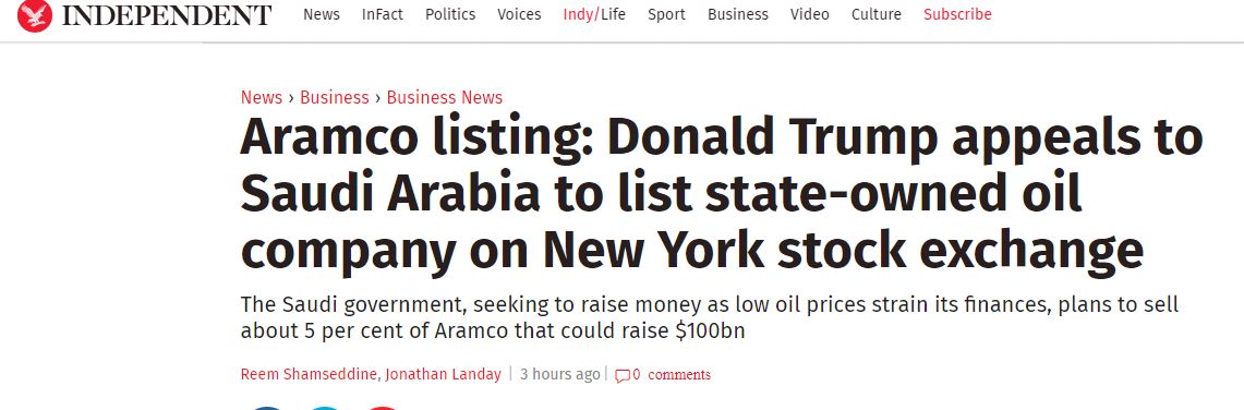 وترى الصحيفة البريطانية، أن تصريحات ترامب جاءت في أعقاب تأكيد العديد من مسؤولي الاقتصاد في واشنطن، على ضرورة أن يكون اكتتاب أرامكو العملاق على رأس أولويات البورصة في نيويورك، كما شددوا على ضرورة استغلال العلاقات الرسمية والودية الرائعة التي تجمع واشنطن بالرياض، لاستضافة الطرح السعودي في العالم المقبل.