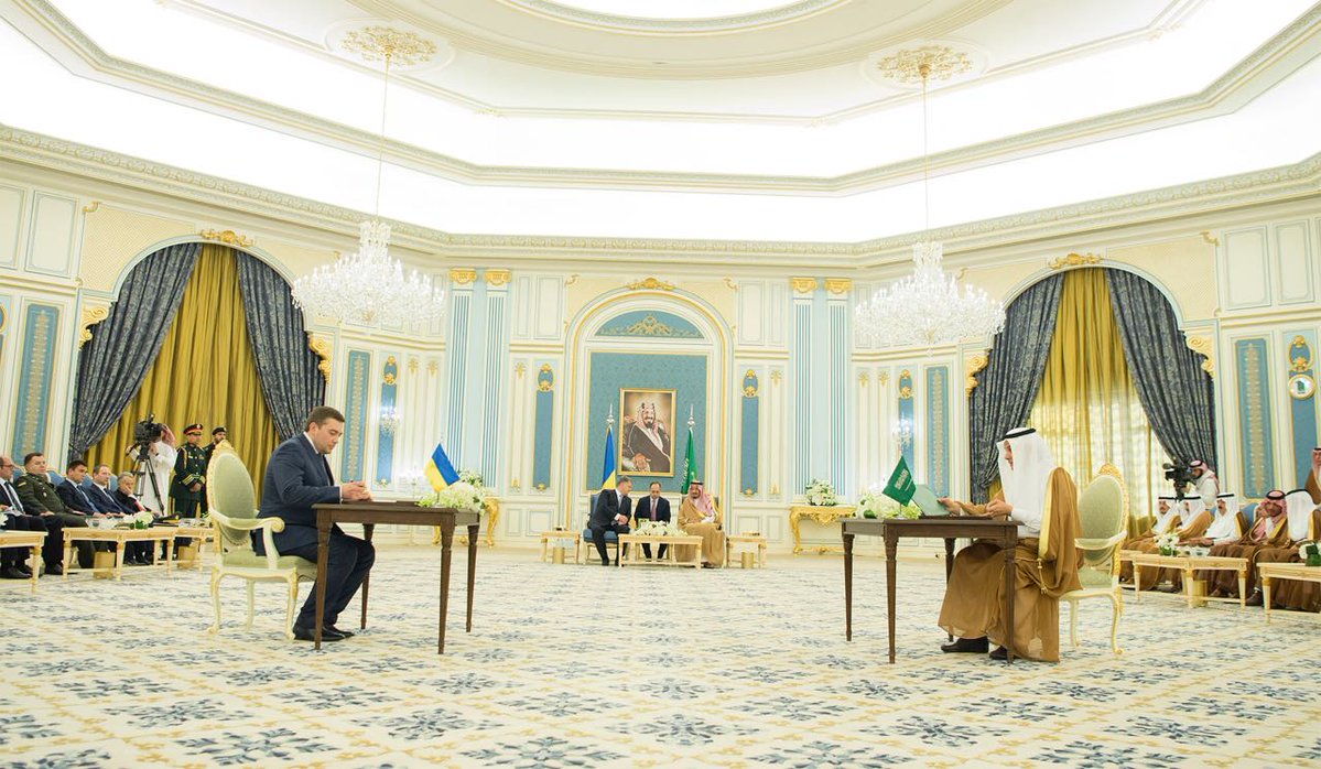 شهد خادم الحرمين الشريفين الملك سلمان بن عبدالعزيز آل سعود – حفظه الله – في قصر اليمامة بالرياض اليوم، وفخامة الرئيس بيترو بريشينكو رئيس جمهورية أوكرانيا توقيع مشروع برنامج تعاون ومذكرتي تفاهم بين حكومة المملكة العربية السعودية وحكومة جمهورية أوكرانيا.