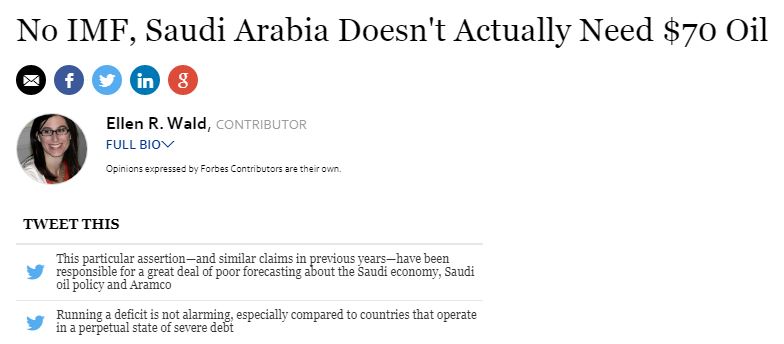 وردت إلين والد، وهي خبيرة اقتصادية دولية تختص في شؤون الحكومات والهيئات الدولية، خلال مقالها في مجلة “فوربس” الأميركية على حديث صندوق النقد الدولي، حيث أكدت أن اقتصاد المملكة لا يحتاج إلى أن يصل سعر النفط إلي 70 دولارا، مشيرة إلى أن القدرات الخاصة بالعمل الاقتصادي في السعودية تؤهلها لتنفيذ المشروعات بشكل جيد.
