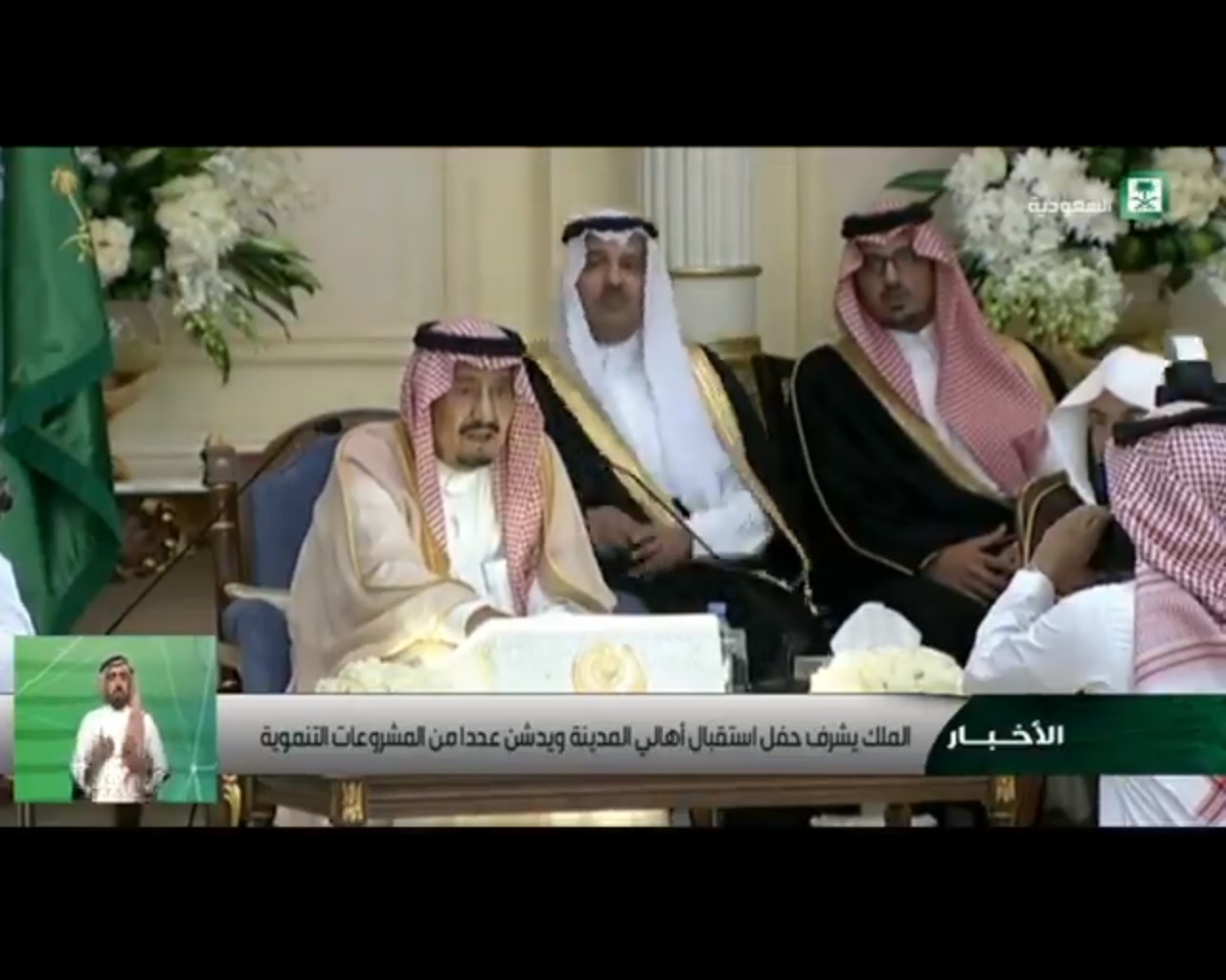 ونشرت القناة السعودية فيديو للملك سلمان خلال تشريفه لحفل استقبال الأهالي.