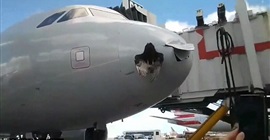 اصطدم طائر بمقدمة طائرة أثناء تحليقها في الجو لينتهي به المطاف معلقًا من منقاره بها حتى الهبوط.