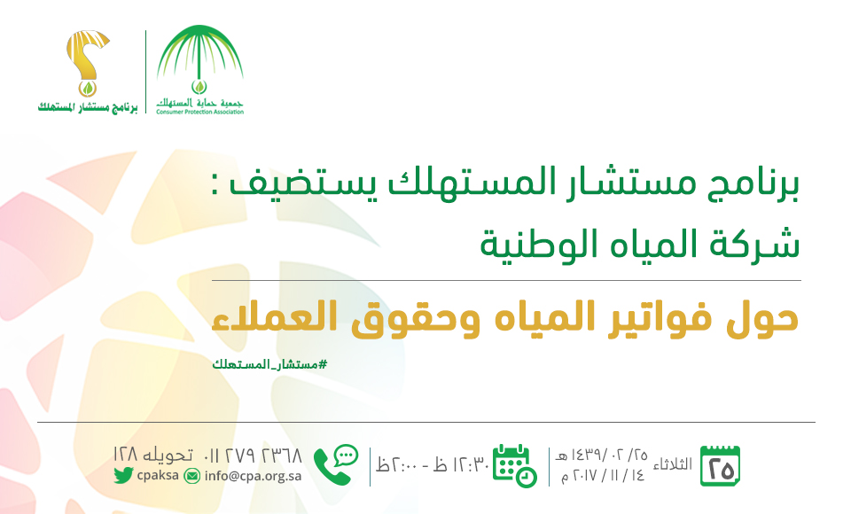 تستضيف جمعية حماية المستهلك، بعد غدٍ الثلاثاء، شركة المياه الوطنية في برنامج “مستشار المستهلك” للحديث عن فواتير المياه وحقوق العملاء لدى الشركة.